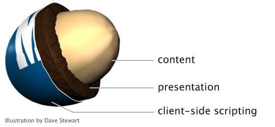 Start with your content peanut, marked up in rich, semantic (X)HTML. Coat that content with a layer of rich, creamy CSS. Finally, add JavaScript as the hard candy shell to make a wonderfully tasty treat (and keep it from melting in your hands).